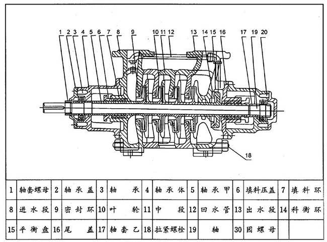 2) 將裝好軸套甲〈5〉和鍵的軸〈9〉穿過進水段〈8〉并推入葉輪(10),并在中段上輔一張紙墊,裝上中段(11),再推入第二個葉輪,重復(fù)以上步驟將所有的葉輪及中段裝完。